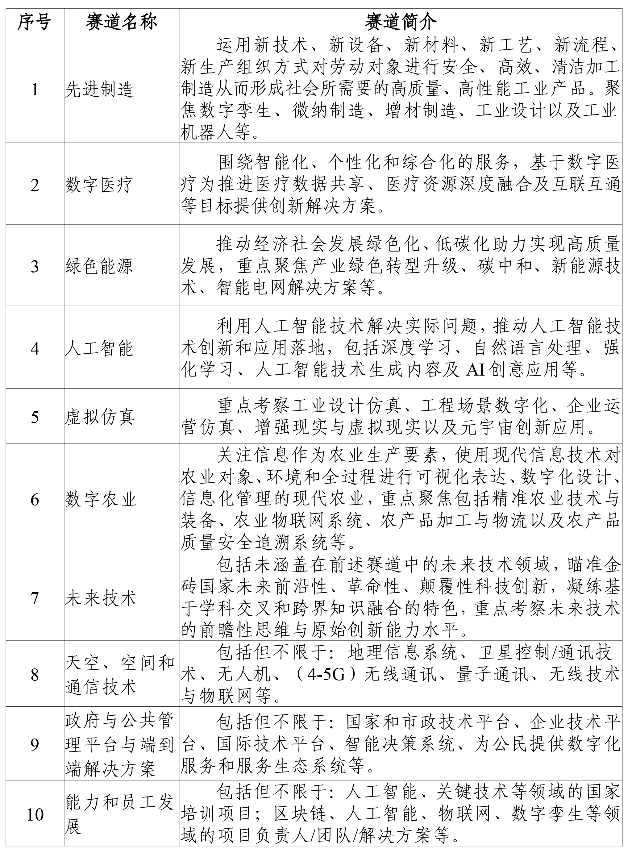 大赛以“技术创新引领金砖国家新工业发展”为主题,设置十大赛道:先进制造、数字医疗、绿色能源、人工智能、虚拟仿真、数字农业、未来技术、天空与空间通信技术、政府与公共管理、端到端解决方案及人才发展。
